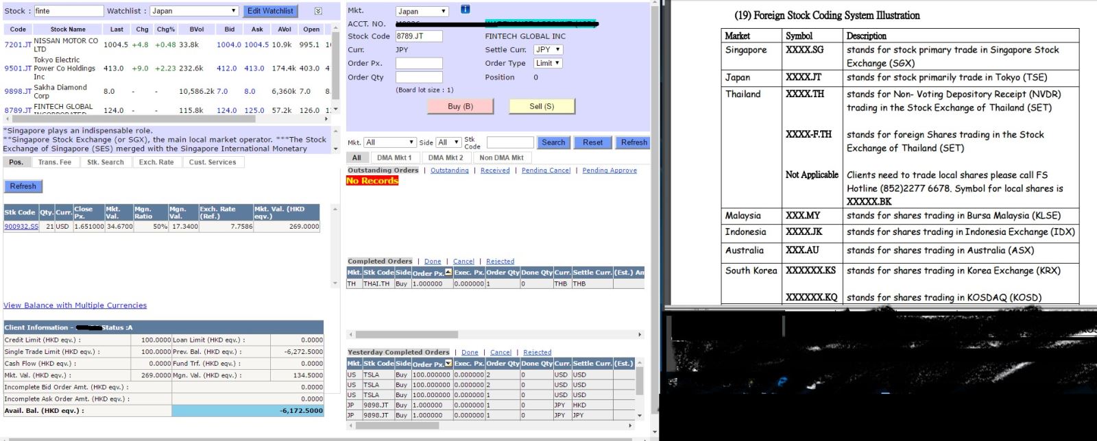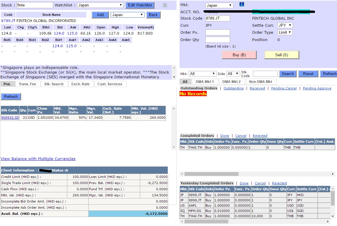 1.) Same user interface with those of Hong Kong stocks, stock option and futures products. Users can monitor order status, positions and fund simultaneously. In addition, order input with tab key with mouse click. 1 click to check the concerned order status.