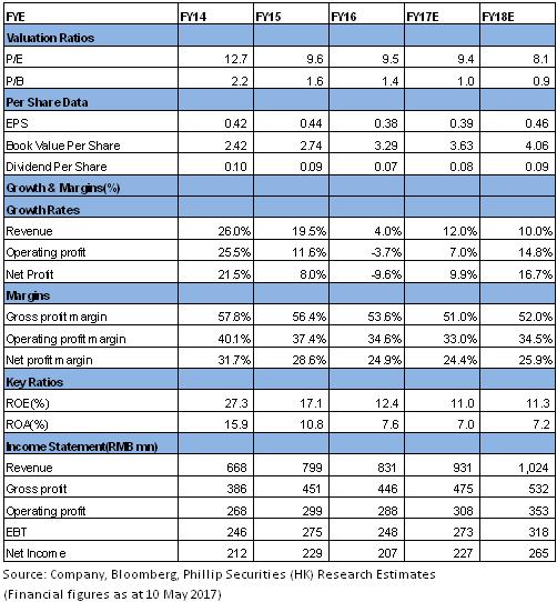 Buy Rating is given with TP of HK$5.00. We expect net profit growth of 9.9%/16.7% in FY2017/FY2018, driven by 12.0%/10.0% revenue growth. Our TP of HK$5.00 represents 11.3/9.7x FY2017E/FY2018E P/E. (Closing price as at 10 May 2017)