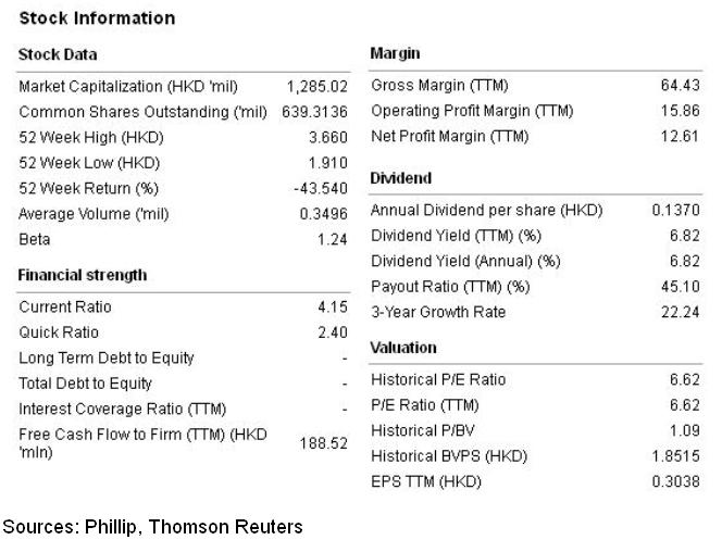 Le Saunda's financial position remains solid, cash per share was HKD 0.66 and NAV per share was HK$1.87. The Company is currently trading at HK$2.03 with trailing dividend yield of 6.82%, which makes it defensive enough to resist further tumble in share price.