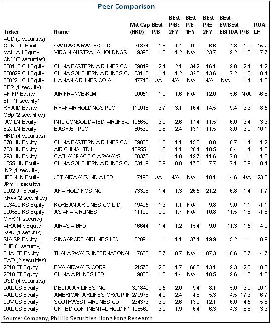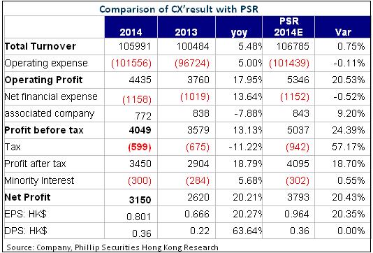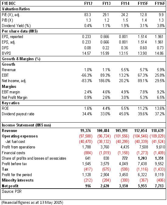 The total revenue of Cathay Pacific fore the 2014 fiscal year grew by 5.5%, i.e. up to HKD 105.99 billion yoy, and the retained earnings attributable to shareholders rose 20% to HKD 3.15 billion yoy, with earnings per share of 80.1 cents. The result was lower than our previous expectations mainly due to a loss of HKD 911 million caused by fuel hedging operation with the net cost of fuel about 3% higher than expected. The Company declared a yearly dividend of 26 cents, plus an interim dividend of 10 cents, which was 36 cents per share annual dividend, which was in line with our expectations, and the annual dividend rate increased to 45%.