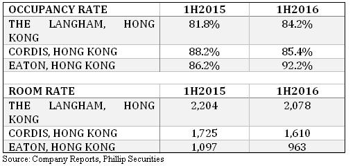 Great Eagle's hotels are well-positioned in the prime location and the heart of the cities. In particular, the London hotel is located at Regent Street, which is the primary shopping area while the New York hotel is located at Fifth Avenue and is just a few minutes` walk away from the Empire State Building. With such a prime location, Great Eagle's hotels regularly achieve high occupancy rate and are able to charge high room rate in recent years and in 1H2016, the Lodnon hotel's occupancy rate reached the 81.8%, the highest in 4 years and the room rate was 274 pound per night, one of the top tier rates in London.