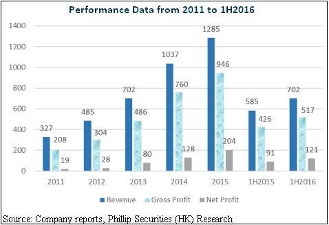 Following charts show the performance data from 2011 to 1H2016(RMB mn). Revenue and net profit increased at CAGR of 40.8% and 80.0% respectively from 2011 to 2015.