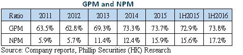 - Good historical performance. Revenue and net profit increased at CAGR of 40.8% and 80.0% respectively from 2011 to 2015. Total revenue increased by 20.03% and the net profit increased by 32.29% YoY in 1H2016.