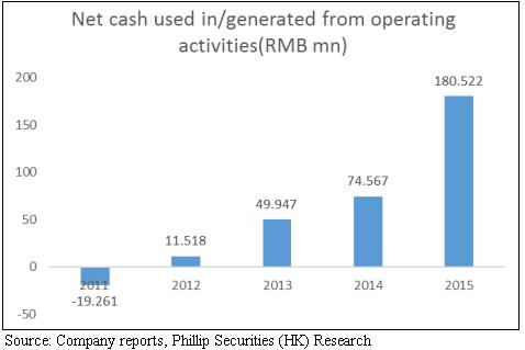 As at end of June 2016, the equity debt ratio was 17.75% compared with 9.82% at the end of Dec 2015. The chart below shows the net cash generated from operating activities in recent years: