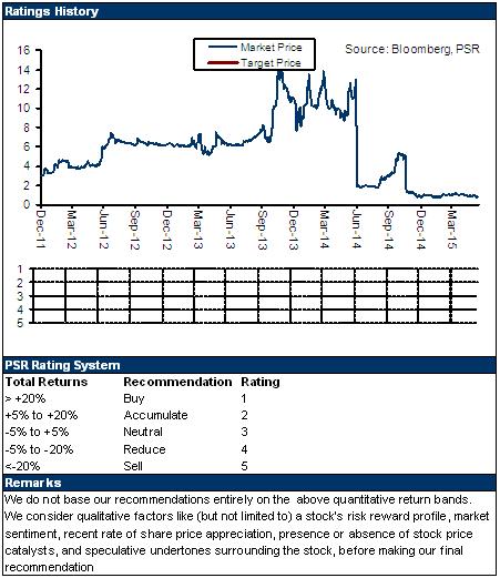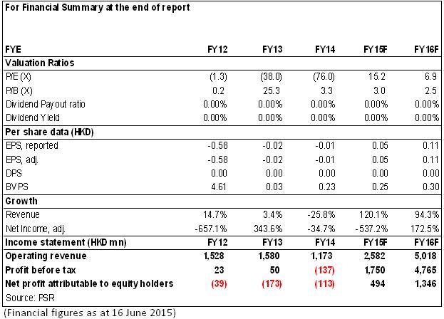 With the backing up of GCL, the company has technology advantages in PV power plant construction and operation while enjoying the preference of material supply from GCL-POLY and GCL System Integration. The three years to come will see the company have a significant increase of installed capacity. Calculated on the basis of 2.6GW and 35% net profit margin to be achieved supposedly at the end of 2015, the company is estimated to record revenues of HK$3.333 billion from electricity sales and net profit of HK$1.167 billion for the electricity sale operaion. Without considering convertible bonds, its current stock price is 8.8X PE. We set its target price for the next 12 months at HK$1.61, equivalent to 15X PE expected for 2016. We give the company a “Buy” rating. (Closing price as at 16 June 2015)