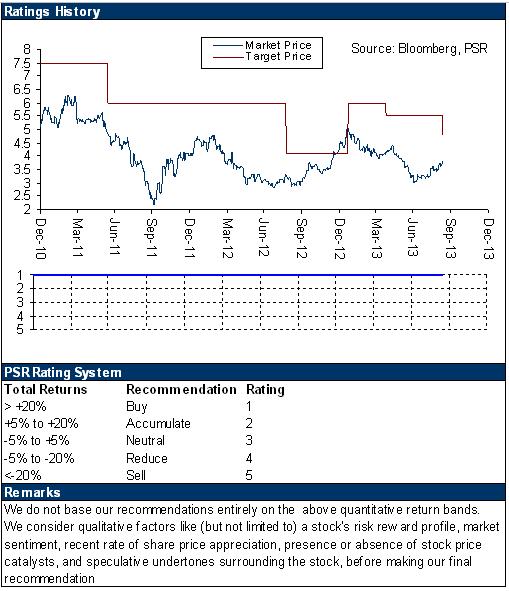 -Considering unstable factors in the markets currently, we cut the 12-M TP to HK$4.85, 28% higher than the latest closing price approximately, equivalent to 6.3xP/E and 1.2xP/B in 2014 respectively. Maintain Buy rating.