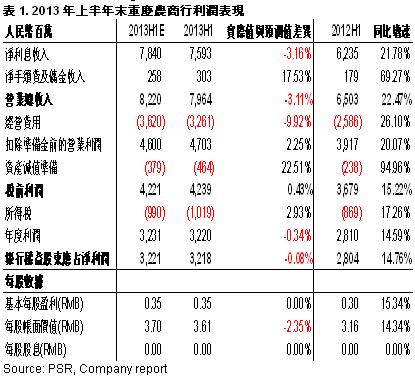 -According to 2013 interim report of CRCB(or the Group), as at the end of 2Q2013, net profits increased by 14.75% y-y to RMB3.217 billion with the slow-down of the growth rate, equivalent to the EPS of RMB0.35, in line with our expectation in Bloomberg;