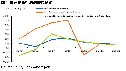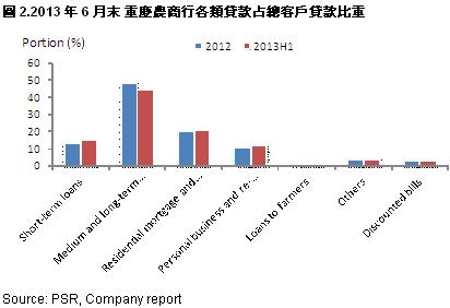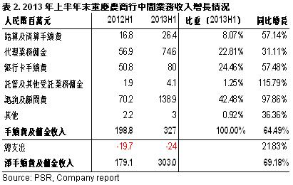 -The main reason of the stable growth of CRCB’s profits is the strong increase of the incomes from all businesses, especially for the intermediate business. By the end of 1H2013, the Group’s net fee and commission income increased sharply by 69.18% y-y to RMB303 million. The largest part of total incomes, net interest income, also increased by 21.78% y-y to RMB7.593 billion;