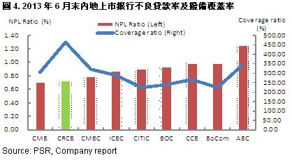 -Asset quality is still better than our expectation with the dual-decrease of the amount and ratio of NPLs, down RMB288 million and 0.25ppts to RMB1.407 billion and 0.73% respectively compared with the end of 2012, and the coverage ratio achieved to 456.93%, up significantly 112.80ppts during the same period. However, compared with 1Q, the decrease rate of the NPLs has narrowed, and we expect the amount will go up in future;