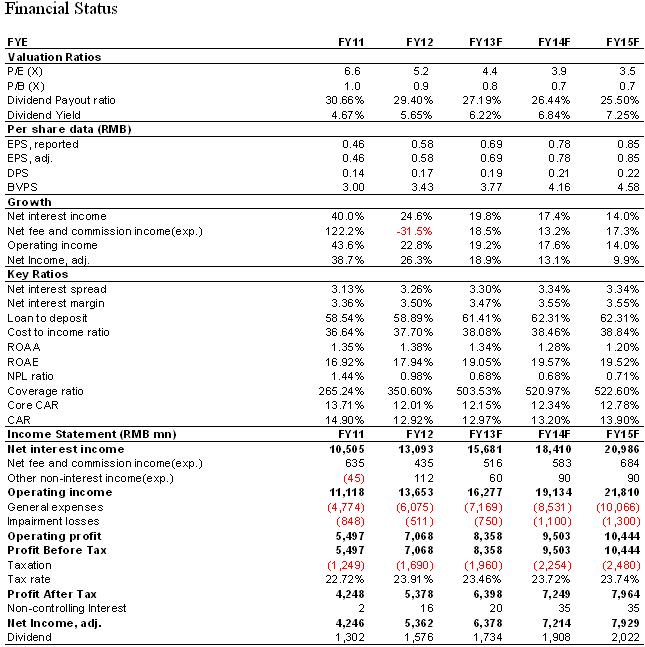 -Overall the bank’s performance met our expectation, we still believe its profit growth would maintain on quite high level in 2013, but the profit growth would go down. We maintain the previous profit estimation that net profits would increase by 19% y-y approximately to RMB6.378 billion with the EPS of RMB0.69;