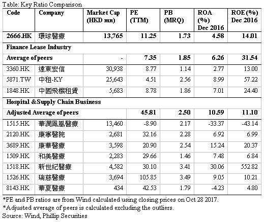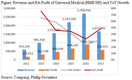 Universal Medical is a leading integrated healthcare solution provider in Mainland China. The company reported revenue of RMB2,700mn/1,653mn in 16/1H17 (+23%/32% YoY), and net profit of RMB872mn/578mn (+32.5%/48.6%). Its service mix comprises three parts: (1) medical equipment financing which constitutes the principal component (72% in 1H17); (2) healthcare industry, equipment and financing advisory services (21%); (3) clinical department upgrade services (5%). Leveraging on the central SOE background, strong medical resources platform and efficient management team, the company develops very quickly with 2012-2016 revenue/net profit CAGR of 46%/48.9%.
