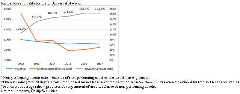 Professional staffs are sent to potential customers to conduct due diligence investigation to estimate whether the customers are capable to carry on lease obligations. After selection, qualified customers with strong cash flow and stable financial condition form a solid base for good asset quality, given the company has never wrote off any accounts receivables until now. The following chart also shows that NPA ratio and Overdue ratio are quite low while Provision coverage ratio is increasing stably indicating highly safety.