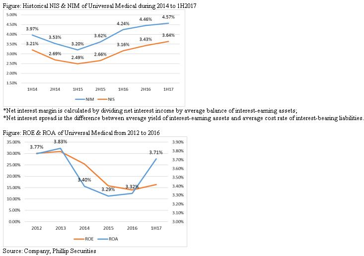 The following chart sets forth Universal Medical's net interest margin (NIM) and net interest spread (NIS) since 2014. Before 2015, the company focused on offshore RMB borrowings as main financing source. As the domestic interest rate was cut down and offshore deposit and lending interest rates hiked due to tight liquidity, the NIS & NIM bottomed out in 1H15. Therefore the management adjusted liability structure through expanding credit line granted by the major domestic lending banks and prepaid some offshore RMB debt. Continued diversification of its borrowing portfolio effectively controlled financing costs and exchange rate risks. In 1H17, both NIS & NIM reached a record high level. We see that the management is of good efficiency and very professionally experienced.