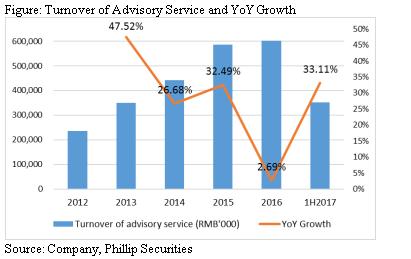 Universal Medical offers comprehensive advisory services which are customized based on the specific requirements of customers, with a focus on industry, equipment and financing. The industry advisory service helps to analyze the competitive landscapes of hospital clients. It uses statistical data to seek diseases that are underserved but prevalent in the region, in order to find the most profitable and efficient growth strategy for hospitals. Universal Medical also helps its customers to choose most suitable and cost-effective equipment. Meanwhile, it gives suggestions about financing options, cash management and operation of purchased or leased assets. This advisory service has achieved quick development with 2012-2016 CAGR of 26.7%. In 1H17, this segment realized 33% YoY growth accounting for 21.9% of company revenue.