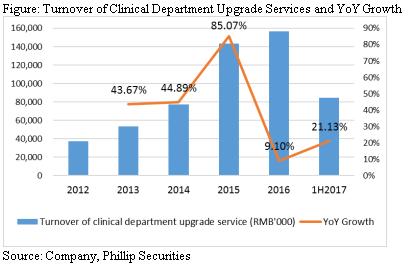 Leveraging on the wide client coverage and enriched industry resources, Universal Medical has developed and now offer CVA (cerebral vascular accident) project solutions and finance lease. The company integrates internal and external resources to assemble project team to provide medical training and support for doctors and professionals, as well as awareness promotion and marketing support. This business posted 2012-2016 CAGR of 43.18% and recorded 21% YoY growth in 1H17. Given it only making up 5% of the topline, we believe that there is still quite room to grow through continued promotion by technology.