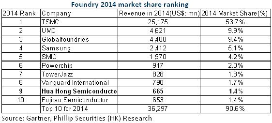 Hua Hong Semiconductor Limited is a pure-play wafer foundry. Based on the revenue in 2014, it ranked the ninth largest semiconductor foundry worldwide, with a market share of 1.4%. Meanwhile, the Company ranked the second among semiconductor foundries in China, right after Semiconductor Manufacturing International Corporation which has a market share of 4.2%. It is worth to note that the Company specializes on manufacturing of semiconductors on 8-inches wafers for specialty applications and it ranks the second among the manufacturers of such wafers worldwide.