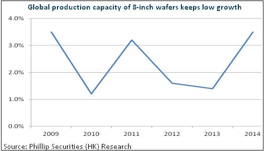 Currently, the global production capacity of 8-inch wafers is relatively tight. According to the information provided by Gartner, the annual growth of global production capacity of 8-inch wafer foundries merely increased 2.5% annually from 2008 to 2014. Among such capacity worldwide, Taiwan and Mainland China accounted for 47% and 18% respectively. In 2015, even though companies including United Microelectronics Corporation, Semiconductor Manufacturing International Corporation, Vanguard International Semiconductor Corporation and Hua Hong announced to expand the production capacity of 8-inch wafers, the increased capacity can only account for 3% of the 2015 annual global capacity based on statistics.