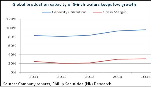 Therefore, the market demand and supply of 8-inch wafers has demonstrated significant improvement. The utility rate of capacity of Hua Hong was also raised significantly to 93.5% in 2014 and 96.1% in 2015Q1 from the previous figures of about 80%. It in turn boosted the profitability of the Company. For example, the gross profit margin increased to higher than 30% from the previous figures of about 20%. We think the demand and supply situation in the industry would still be tight, while the Company's profitability could keep on a high level.