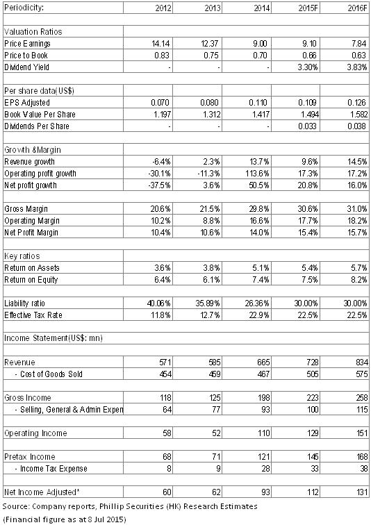 Even though Hua Hong specializes on the production of 8-inch wafers which are comparatively backward, the Company enjoys a leading position in this field. Moreover, the segment of 8-inch wafer production brings solid and steady growth to the Company. Market demand is improving, particularly the Chinese domestic market. Localization of the production of wafers also supports the release of demand. We expect the Company would still maintain high level of utility rate on capacity, as well as profitability. We give the Company a valuation level corresponding to 1x of book value per share in 2015. Target price is set as HK$11.58, with the “Buy” rating initially. (Closing price as at 8 July 2015)