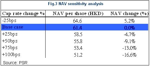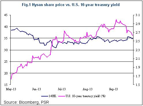 Scenario analysis on cap rates change – Hysan`s NAV is sensitive to cap rates change due to its pure landlord nature: We can see from fig. 1, Hysan`s share price slumped 19.7% to the lowest point on 25 June since 1 May (before our coverage) with the U.S. 10-year treasury yield surge, which climbed from 1.63% on 1 May to the highest point of nearly 3% on 5 Sep. The interest rate hike obviously triggered investor concern of cap rates expansion on the rental properties. We were aware of the concern of negative impact from higher cap rates assumption on HK property sector, especially on the landlords, we did a scenario analysis on cap rates change for Hysan. We found that our NAV estimate would drop 4.7%/9.1% for 25/50 bps added to cap rates and in the extreme case of 100 bps cap rates expansion, our NAV estimate would decline 16.6%. Not surprising that Hysan`s NAV is quite sensitive to the cap rates assumption, mainly due to its pure landlord nature (HK investment properties account for 95.2% of NAV, from our estimates). However, we would like to highlight that we have already given a conservative cap rates assumption, which is >5% for retail and ~4.8% for office portfolio. Moreover, U.S. 10-year treasury yield dropped to 2.64% yesterday after the outcome of the FOMC meeting that Fed will maintain the same pace of bond purchases. We believe it relieves investor concern of interest rate hike and give support to Hysan`s valuation.