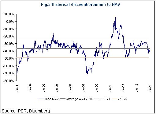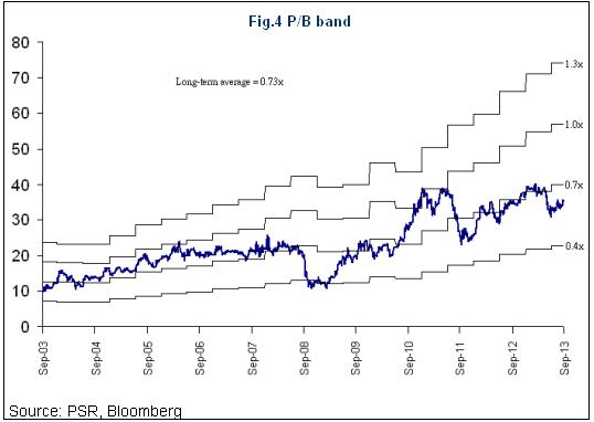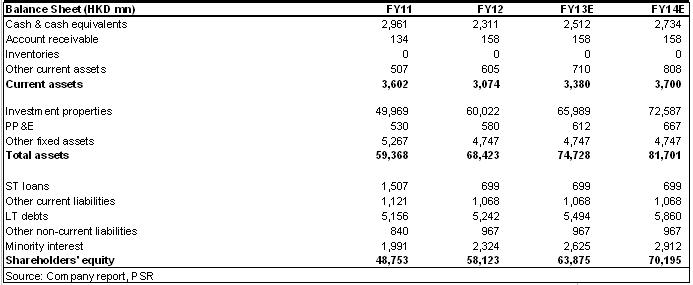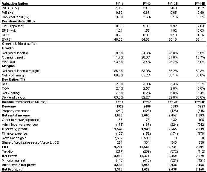 Valuation: We roll our NAV estimate to FY14, which is HK$61.4 per share, 5.7% lower than our previous FY13 estimate, due to a higher risk-free rate assumption. Hysan is now trading at P/B of 0.61 (vs. historical average of 0.73) or our 43.1% discount to our FY14 NAV estimate (vs. historical average of 36.5% discount). Hysan performed well in 1H13, Net rental income surged 41.1% yoy due to contribution of Hysan Place and robust organic growth, rental reversion of retail/office sectors reached 50%/40% in the period, occupancy rates were 99% and 93% for retail and office portfolio respectively. We don`t see a high downside risk on the rental income and occupancy rates of Hysan`s investment property portfolio, so current valuation is inexpensive in our view. We retain a same NAV discount target of 36.5% and get a TP of HK$39.00. We give an “Accumulate” rating to Hysan with upside potential of 11.6%.