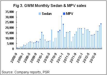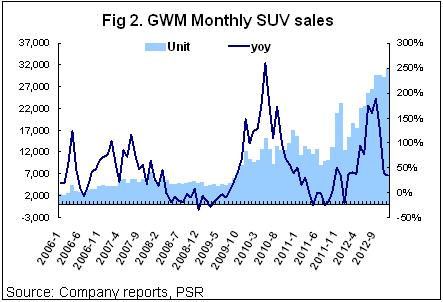 ·SUV需求持续畅旺:长城汽车两款热销SUV之一M4自上市以来,月销量已经突破8000,而随着公司天津工厂产能逐渐释放,H6的月销量保持在1.5万以上,且目前H6和M4的库存依然紧张,提车需等待一个月以上。H6的1.5T版本在12年四季度上市,13年公司仍将密集投放新车型,预计将推出的SUV包括H6运动版,H5大改款和H2,H8两款新SUV。H2的定位在H3之下,H8是公司首款中高端SUV,预计售价在15-20万,直接进入到合资品牌市场区间。我们认为,凭藉自身不断丰富的产品线和良好的品牌形象,公司SUV产品的竞争力将进一步提升。