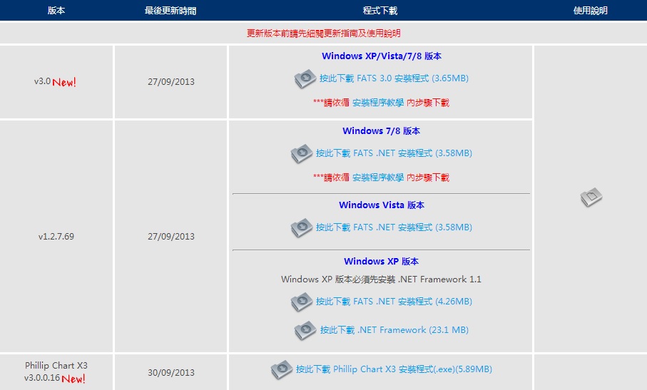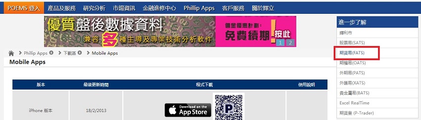 於主网页选择「Phillip App」,然後选「下载区」。 打开後,在右方「进一步了解」选择「期货易(FATS) 」 。 进入後会发现有2个版本的FATS,分别是V.3.0 及 V1.2.7.69。两个版本可同时安装及打开。不论客户本身是否已经安装FATS,都可以直接安装新版本FATS3.0。 另外,客户亦可直接下载及安装Phillip Chart X3,完成後於FATS3.0里便可直接开启。请注意,Phillip Chart X3只能於FATS3.0里打开,旧版本的FATS不能打开Phillip Chart X3. 最後,如客户对FATS3.0平台有任何意见或提议,欢迎电邮至ats@phillip.com.hk,我们会尽力改进。