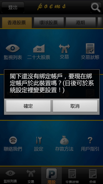 大家不用奇怪,这是我们最新的讯息提示功能(Notificaition)。只要绑定帐户及装置,我们往後便能为大家提供即时讯息,例如到价提示、GTC指示到期日或成交覆盘等个人资讯。现阶段,我们会不定时发送最新的新股资讯给客户,例如新股资料及孖展额等。 由於绑定帐户只能将一个户口绑定於一个装置,如客户使用2台或以上的装置,於第2台装置登入时便会询问是否绑定帐户於新装置,大家可随使用习惯决定是否绑定。另外,绑定帐户後不能自已解除,如要解除帐户绑定,可致电2277-6661,我们会即时为大家解除绑定。 自行决定是否接收讯息提示 如客户不欲接收我们提供的讯息提示,可於设定里选择” 讯息提示功能” 按” 讯息提示功能” 进入设定画面。 绑定中帐户显示现在此装置已绑定的帐户。 语言可选择接收讯息的语言(与装置预设语言无关) 最新资讯可选择愿意或不愿意接收最新资讯/推广等。(系统讯息不包括在内) 帐户绑定指是否绑定帐户,如已绑定,不能自行解除。 储存及变更,如更改任何讯息提示功能的设定,必须按下储存及变更才能生效。 帐户绑定状态检查指当登入时会否检查绑定状态,例如此帐户或装置是否已绑定等。 如欲查询更多相关资讯,欢迎致电2277-6661。