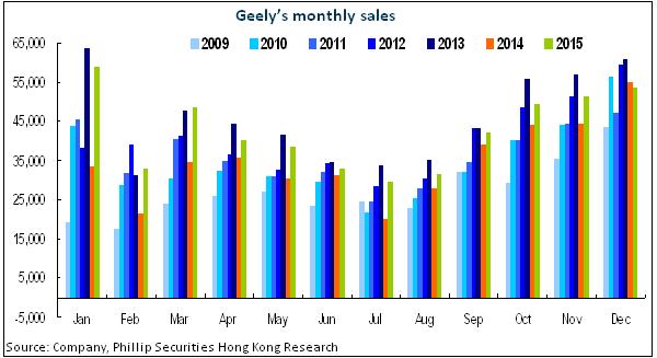 吉利汽车近期发盈利预喜,预期公司截至2015年底止年度录得的净利将录得约50%至60%的升幅,至21.45亿至22.88亿元人民币,惟增长不及我们之前预期的72%,亦低过市场预期。