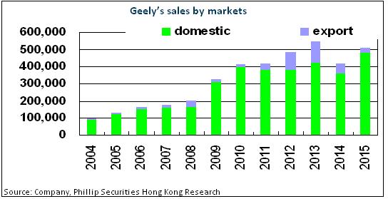集团於2015年全年的总销量为509,863辆,按年增长约22%,较年初预订的目标多销13.3%,我们认为,新车效应和去年低基数是公司销量增长的主因。分市场看,国内销量保持强劲动力,其总销量按年增长约34.2%至480,518辆。出口量则按年减少约50.4%至29,579辆,因公司主要出口市场之政治及经济环境仍不稳所致。