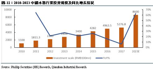 水务行业作为弱周期性行业,行业发展程度与经济增长水平、人口数量及城市化进程等因素高度相关。近年来,行业政策监管要求不断加强,黑臭水体治理、海绵城市建设、乡镇污水处理等领域快速增长,总体来看,水务行业投资规模不断变大,市场容量仍存有较大发展空间。根据前瞻产业研究院资料,“十二五”期间水务行业投资年均增速达24%,预计到2023年,我国水务行业的年度投资额将突破8600亿元。