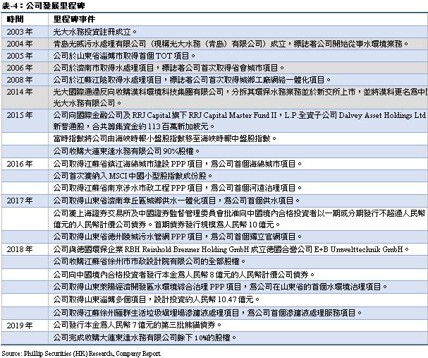 公司主要通过三种方式实现自身增长:1、自地方政府获取新项目;2、项目提标及扩建;3、收购。2014年,公司通过反向收购汉科实现股份於新交所上市,涉及收购总设计污水处理能力795,000吨/日的17个现有项目并在收购後再获取七个新项目。2015年,公司收购大连东达90%的股权,公司总设计污水处理能力因此提升835,000吨/日,市场地位亦得到提升。公司於2018年6月收购徐州设计院,徐州设计院主要专注於道路、桥梁、隧道、给水、排水、热力、燃气、电力、建筑、园林景观、环境卫生、公路及水利工程勘察、测绘、设计及谘询;以及工程造价谘询;施工图审查;招标代理及工程项目管理。於完成收购徐州设计院後,其与技术中心整合为公司的新技术及设计中心。此外,於2018年2月,为增强公司的研发能力,公司与德国环保公司RBH Reinhold Brenner Holding GmbH 注册成立 E+B Umwelttechnik GmbH,将专注於市政污水及工业废水处理项目、污泥处理项目及淡化项目等的投资、设计、建造及管理相关的技术研发,包括第三代曝气生物滤池、SL高效斜管沈淀、膜防生物污堵等。