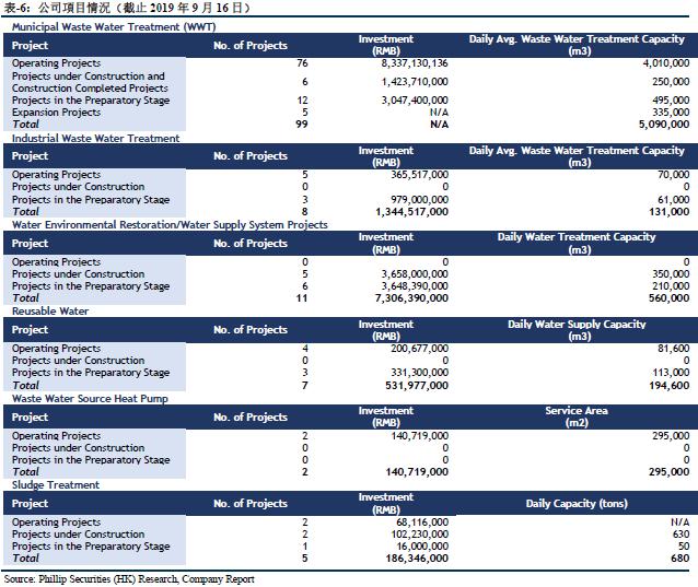 公司亦从事以下项目的设计、建造、运营及维护:(i)供水项目,包括水库补水、水厂建设及供水、城乡供水、水库建设及供水管网建设;(ii)中水回用项目,该项目使用公司污水处理厂处理的水供发电厂循环利用水资源或自发电厂生产超纯水作工业循环利用;及(iii)污水源热泵项目,该项目从公司污水处理厂排放的水中提取低品位热能源,於冬季及夏季为大楼的冷暖气机提供能量,以达致节能环保。公司根据与中国地方政府订立的服务特许经营安排承接该等项目。公司於2018年底,拥有6个投运的其他项目,包括4个中水回用项目及2个污水源热泵项目,总设计处理能力为81,600吨/日,公司透过BOT、BOO及自营项目模式开发及运营该等项目。