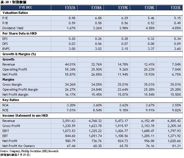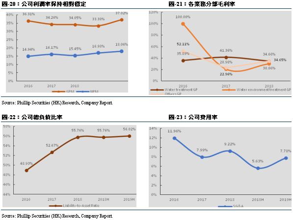 我们预测公司FY19/FY20/FY21年营业收入分别为港币54.7/61.5/65.9亿元,同比增长14.78%/12.41%/7.04%;毛利为港币19.2/21.5/23.1亿元,同比增长17.99%/12.41%/7.04%;股东应占净利为港币7.6/8.8/9.4亿元,同比增长12.21%/15.93%/6.75%;对应EPS分别为港币0.28/0.32/0.34元。公司作为中国领先的水环境治理公司,项目处理能力实现稳定增长,我们相信,凭藉公司成熟的项目经验,公司未来业绩将实现持续的增长。