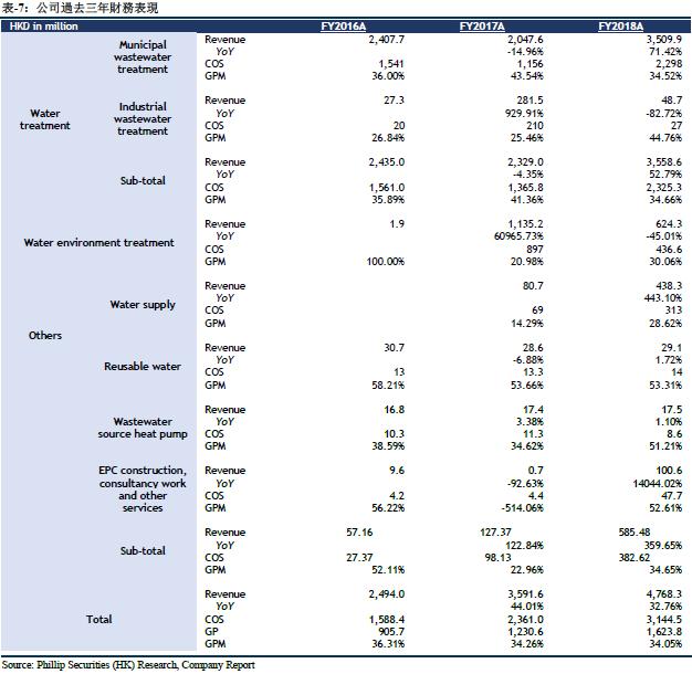 截至2016年、2017年及2018年12月31日止年度,公司的其他项目分别合共占收益的1.9%、3.5%及10.1%,及分别占毛利的2.7%、2.6%及9.3%。除综合水治理服务外,公司亦提供EPC建设、谘询工作及其他服务,截至2016年、2017年及2018年12月31日止年度分别占公司的收益约0.4%、0%及2.1%。