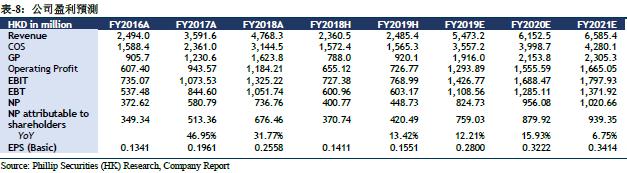 截至2019年6月30日止六个月,公司实现营业收入24.85亿港元,同比增长5%;实现毛利9.20亿港元,同比增长17%;实现公司权益持有人应占盈利4.20亿港元,同比增长13%。公司收益及纯利由2016年的2,494.0百万港元及372.6百万港元分别增加至2018年的4,768.3百万港元及736.8百万港元,复合年增长率分别为38.3%及40.6%。