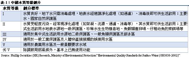 根据国家环保总局发布的《地表水环境质量标准(GB3838-2002)》,中国水质划分为6个等级:I、II、III、IV、V 和劣V,其中I~III为优良水质,详细划分标准如下:
