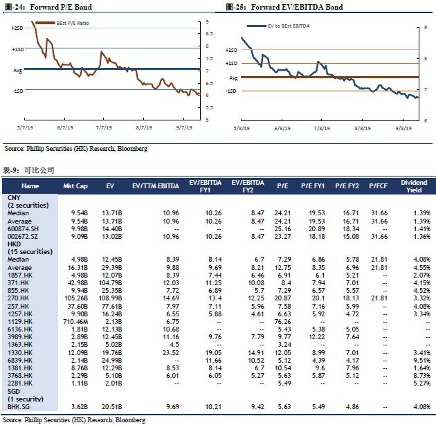 我们采用剩余收益估值模型,假设要求回报率为6.01%,抗衰减因数为0.20,我们得到目标价2.64港币,对应FY19/FY20/FY21 9.42x/8.18x/7.72x PE,较现价(HKD1.76 as of September 20, 2019)有+49.79%的升幅,给予“买入”评级。