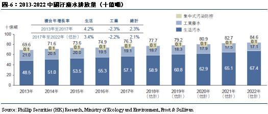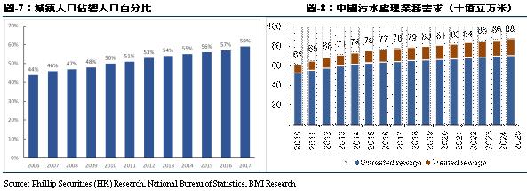 根据国家统计局数据显示,自2013 年至2017年,中国城镇人口从731.1百万增至813.5百万,复合年增长率为2.7%。同期,中国城镇化率从53.7%增加4.8%至58.5%。中国城镇人口预计将於2022年前达到934.5百万,对应城镇化率可能达65.8%。与此对应,根据BMI Research预测,至2025年,中国污水处理需求量将达到880亿立方米。综合来看,中国污水处理市场需求强劲而供应不足,未来污水处理业务仍存在许多长期机遇。