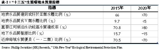 根据2016年11月国务院印发的《“十三五”生态环境保护规划》指出,到2020年,地级及以上城市集中式饮用水水源水质达到或优於Ⅲ类比例高於93%;全国地下水污染加剧趋势得到初步遏制,质量极差的地下水比例控制在15%左右;地级及以上城市建成区黑臭水体比例均控制在10%以内,其他城市力争大幅度消除重度黑臭水体;沿海省(区、市)入海河流基本消除劣V类的水体;到2020年,全国所有县城和重点镇具备污水收集处理能力,城市和县城污水处理率分别达到95%和85%左右,地级及以上城市建成区基本实现污水全收集、全处理;提升污水再生利用和污泥处置水准,大力推进污泥稳定化、无害化和资源化处理处置,地级及以上城市污泥无害化处理处置率达到90%,京津冀区域达到95%;实现缺水城市再生水利用率达到20%以上,京津冀区域达到30%以上;推进海绵城市建设,能够将70%的降雨就地消纳和利用的土地面积达到城市建成区面积的20%以上,地级及以上缺水城市全部达到国家节水型城市标准要求,京津冀、长三角、珠三角等区域提前一年完成。“十三五”生态环境保护水环境质量主要包含以下指标: