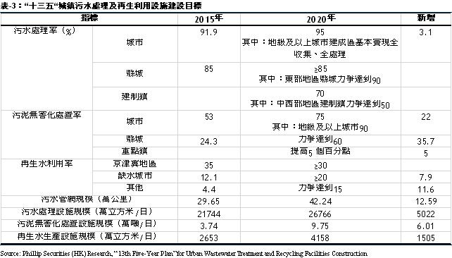 另据2016年12月国家发展改革委会同住房城乡建设部共同编制的《“十三五”全国城镇污水处理及再生利用设施建设规划》指出,截至2015 年,全国城镇污水处理能力已达到2.17 亿立方米/日,城市污水处理率达到92%,县城污水处理率达到85%;“十三五”期间规划新增污水管网12.59 万公里,其中,设市城市6.62 万公里,县城2.92 万公里,建制镇3.05 万公里;老旧污水管网改造2.77 万公里,其中,设市城市1.58 万公里,县城0.73 万公里,建制镇0.46 万公里;合流制管网改造2.88 万公里,其中,设市城市1.70 万公里,县城1.17 万公里;新增污水处理设施规模5022 万立方米/日,其中,设市城市2856 万立方米/日,县城1071 万立方米/日,建制镇1095 万立方米/日;提标改造污水处理设施规模4220 万立方米/日,其中设市城市3639 万立方米/日,县城581 万立方米/日;新增污泥(以含水80%湿污泥计)无害化处置规模6.01 万吨/日,其中,设市城市4.56万吨/日,县城0.92 万吨/日,建制镇0.53 万吨/日;新增再生水利用设施规模1505 万立方米/日,其中,设市城市1214 万立方米/日,县城291 万立方米/日。