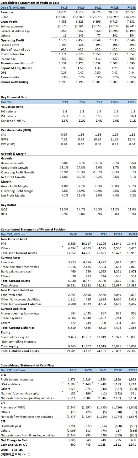 尽管中国内地上半年实施相对严格管控措施以应对反覆的新冠疫情,导致消费需求减弱及物流运输中断,维达的盈利也受到持续上涨的生产成本(木桨价格处於高位)及物流成本所带来的影响,但整体的销售表现依然强韧;此外,相信维达仍会持续调整价格以及优化成本,以减少原材料及其它成本上涨所带来的负面影响,并预料下半年上述不利的情况将有所舒缓。我们预期公司2022至2023年EPS预测为1.25元及1.32元,目标价为21.0港元,对应2022的预测市盈率为16.8倍(与过去5年平均市盈率相若),评级为“中性”。