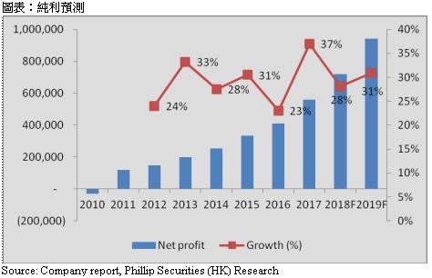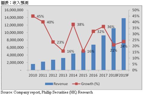 公司在今年起将集团营业额分成传统业务及新兴业务。我们预测传统业务在2018/19年的增长,分别为15/14%,由於公司预告未来来自华为的收入增长将会开始减慢。然而,其他客户(例如:滙丰、腾讯及中国平安等)的业务增长将会保持强劲,约20-30%。而新兴业务方面,基於网络效应,我们预计解放号及云业务增长会在2018/19年逐步加强,分别为80/85%。