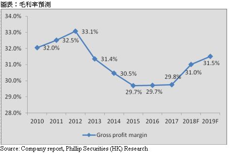 公司毛利率自2012年开始下跌。然而,由於新兴业务的毛利率较高,在新兴业务占比增加下,我们估计毛利率在2018/19年为31/31.5%。
