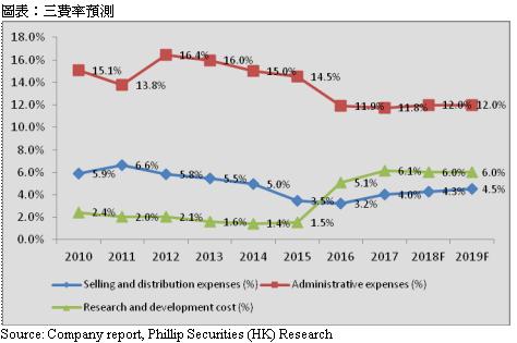 我们预测行政成本及开发费用占收入比在2018/19年将会保持稳定,分别为12%及6%;销售成本占收入比则由於新兴业务之快速增长而上升,在2018/19年分别为4.3/4.5%。