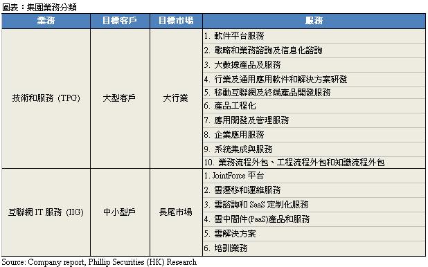 公司把业务主要分成两部分﹕1) 技术和服务集团 (TPG)及2) 互联网IT服务集团 (IIG)。TPG主要为客户提供软件开发、业务谘询、解决方案及流程外包等服务,并主要面向大客户和大行业。主要客户有华为、滙丰及腾讯等等。IIG主要为在线业务,以解放号作平台为对价格敏感的客户及长尾市场提供服务,例如﹕网上发包、云服务及培训业务。