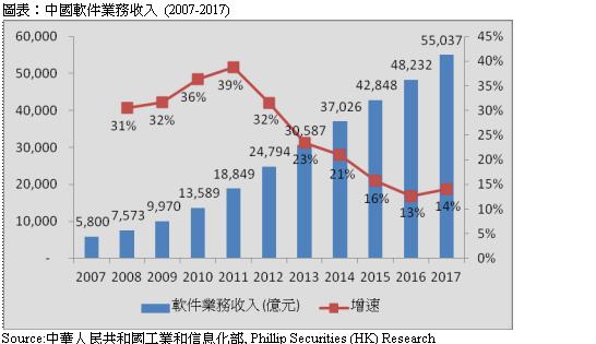 由於数码化及智能手机的兴起,同时受惠於国家政策的支持,中国软件业平稳持继续发展。软件业务收入在过去十年间保持上升趋势,由2007年的5,800亿人民币升至2017年的55,037亿人民币,复合增长率为25%。惟增长在2011年後见顶,并开始放缓。然而,在2017年,软件收入轻微回升,主要由於大数据及云端服务日渐流行。