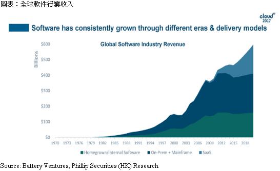 在2000年前,软件市场的增长主要由自研及内部软件主导。在2000年後,主机及本地软件开始成为新的增长点。而在2006年,SaaS开始发展,并成为软件市场的新引擎。据Gartner预测,全球SaaS收入在2021年将达到1,117.1亿美元,2017-2021年复合增长率为18%。中国SaaS市场增长更强劲,根据IDC预测,直至2021年,中国SaaS市场规模将达到48.9亿美元,2017-2021年的年复合增长率将超过40%。