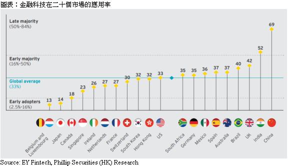 在数码化的大趋势下,软件科技逐渐被引入不同行业,如政府、医疗、能源、金融、物流等行业。其中金融科技便是软件科技与传统金融两者融合的佼佼者。软件科技在金融上的应用场景非常广泛,例如支付及电子钱包、投资、P2P借贷、保险及财务管理等等。在中国,微信支付及支付宝等电子支付工具已经被广泛使用。根据EY Fintech所计算的金融科技应用率,全球平均应用率由2015年的16%大幅上升至2017年的33%,已达到早期采用人群阶段(Early Majority)。中国(69%)及印度(52%)甚至到达後期采用人群阶段(Late Majority)。随着南非、韩国及墨西哥的应用率上升,EY预计未来全球平均应用率可达到52%。相信未来会有更多传统行业数码化转型,届时软件科技需求将能保持强劲。
