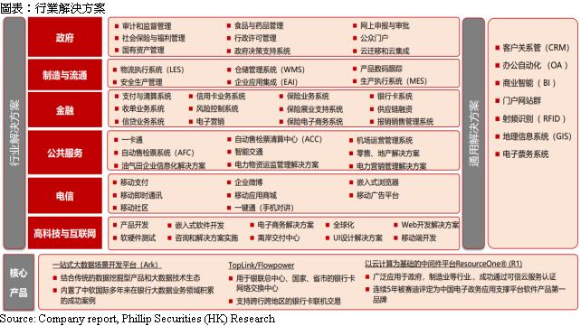在金融方面,公司自主研发的支付类平台产品Toplink/ Flowpower,为公司的核心产品之一,主要用於银联总中心、国家、省市的银行卡网络交换中心,亦支持跨地区的银行卡联机交易。在境内,公司一直为五大国有银行、邮政储蓄银行及外资在华金融机构等客户提供行业解决方案、系统集成服务以及相关的高端服务。在境外,滙丰银行是公司的主要客户,为汇丰全球在中国区的主要供应商。此外,公司的经验涉猎金融行业中多项业务,包括:支付及结算系统、信用卡业务、保险业务系统、银行卡系统、信贷业务系统及风险控制系统等等。同时,公司实现「全国三个第一」——全国第一个银行卡跨行支付网络系统、全国第一个金融IC卡支付清算系统和全国第一个电子商务网上支付结算系统。